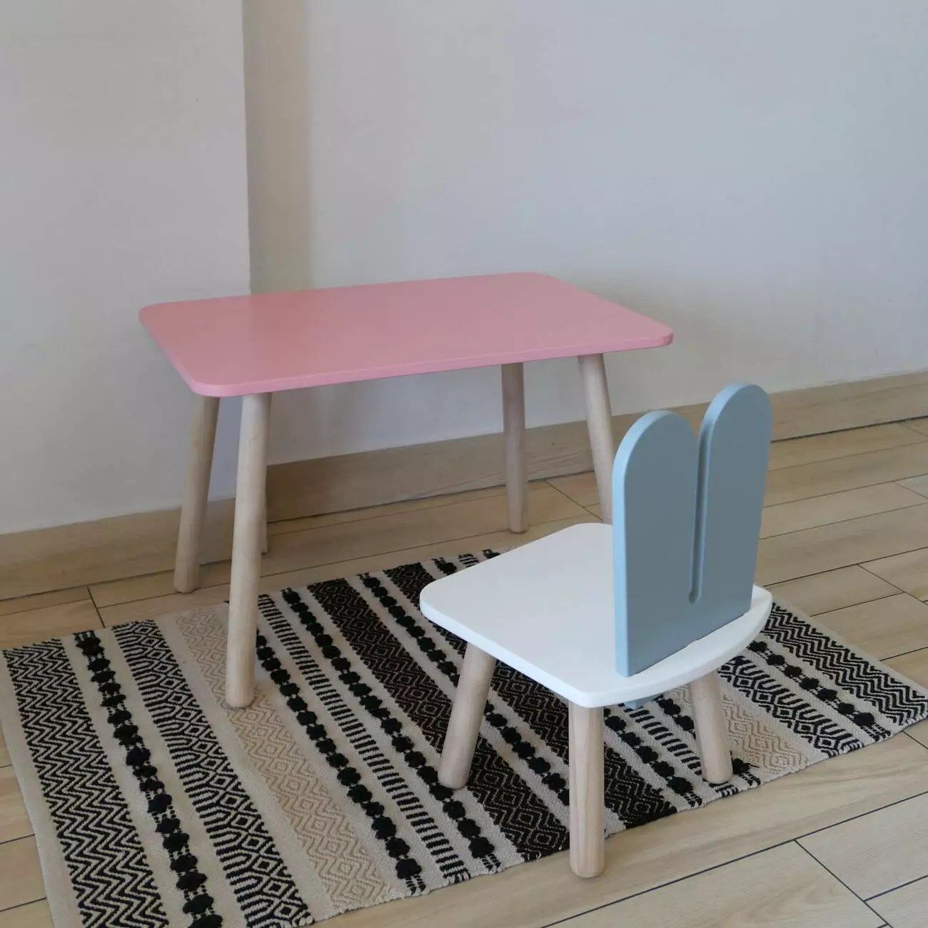 Комплект стіл та стул дитячий ChildWood - Set Стіл рожевий прямокутний + стілець білий сірий Зайчик (Фанера)