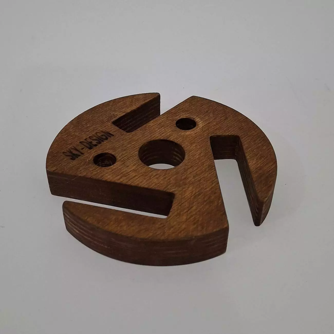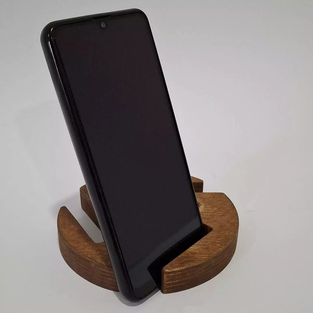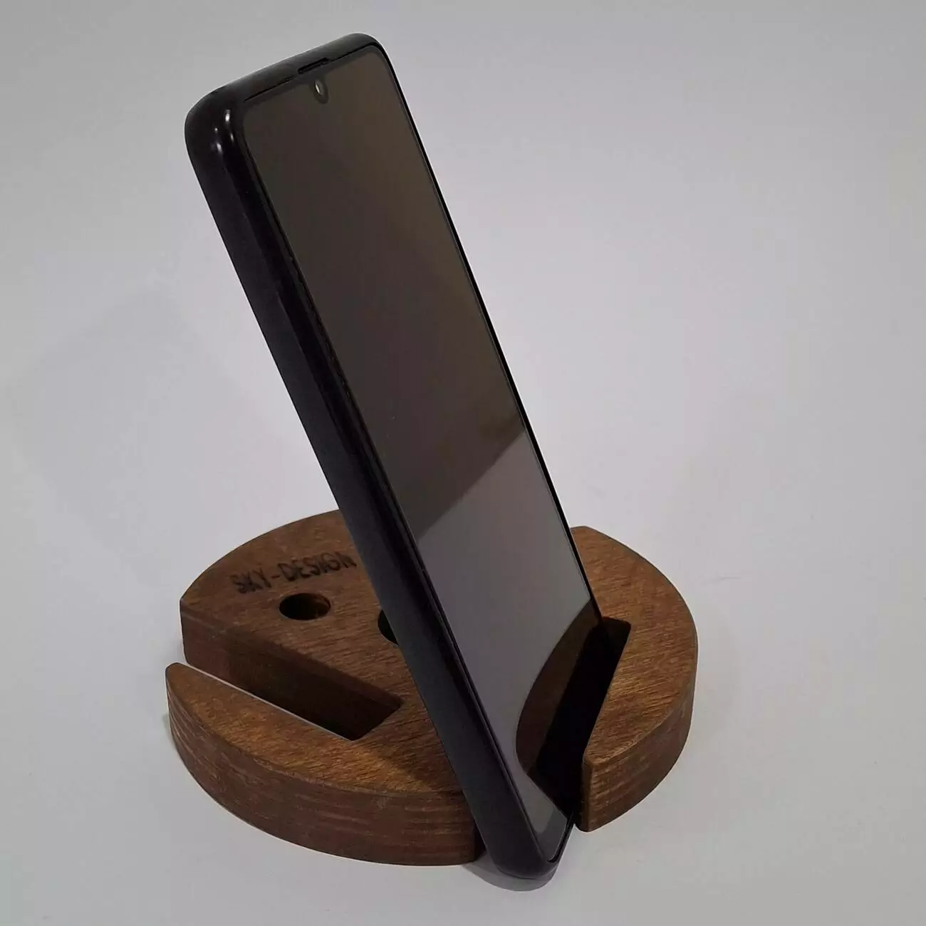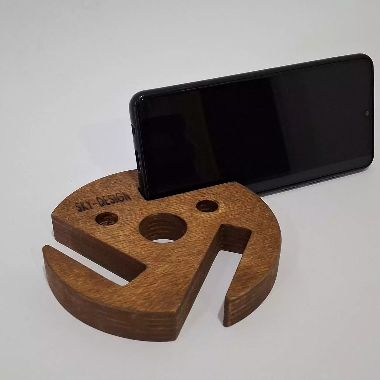 Тримач виконаний з натуральної вологостійкої фанери, товщиною 18мм. Має ергономічну форму, яка дозволить розташувати Ваш гаджет в будь-якому зручному положенні. Має декілька фіксуючих положень, дозволяє розміщувати телефон як горизонтально так і вертикально.