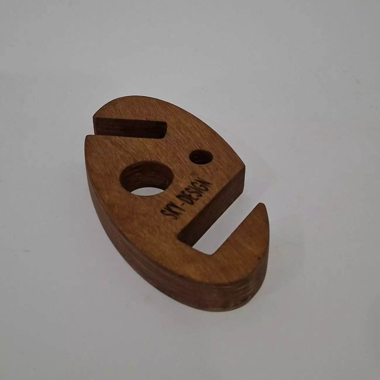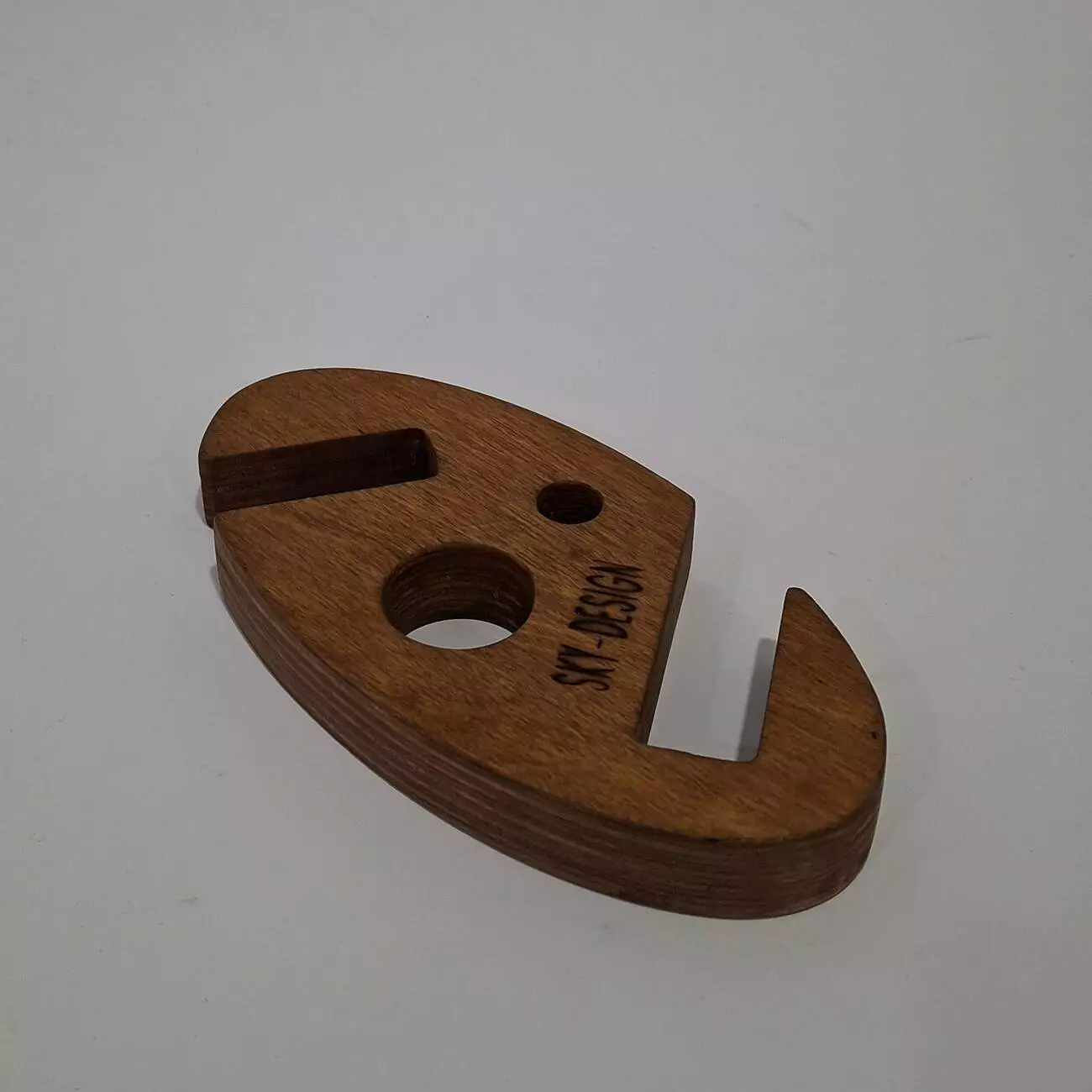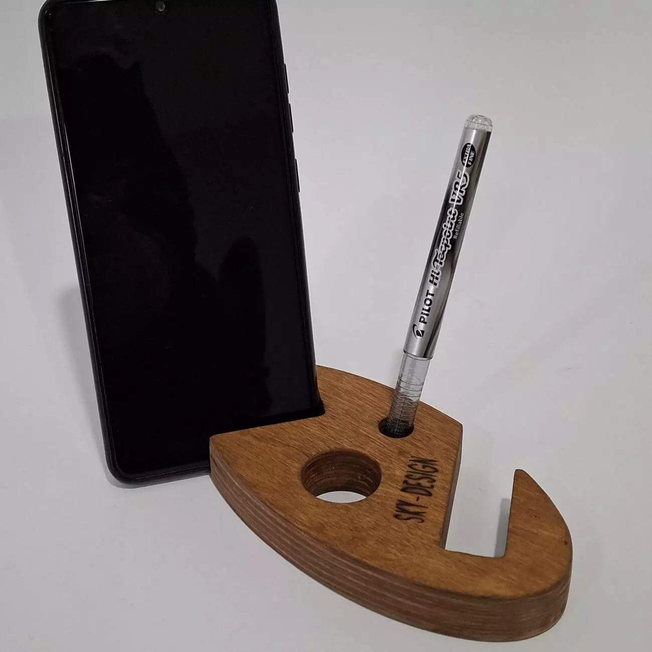 Тримач виконаний з натуральної вологостійкої фанери, товщиною 18мм. Має ергономічну форму, яка дозволить розташувати Ваш гаджет в будь-якому зручному положенні. Має декілька фіксуючих положень, дозволяє розміщувати телефон як горизонтально так і вертикально.