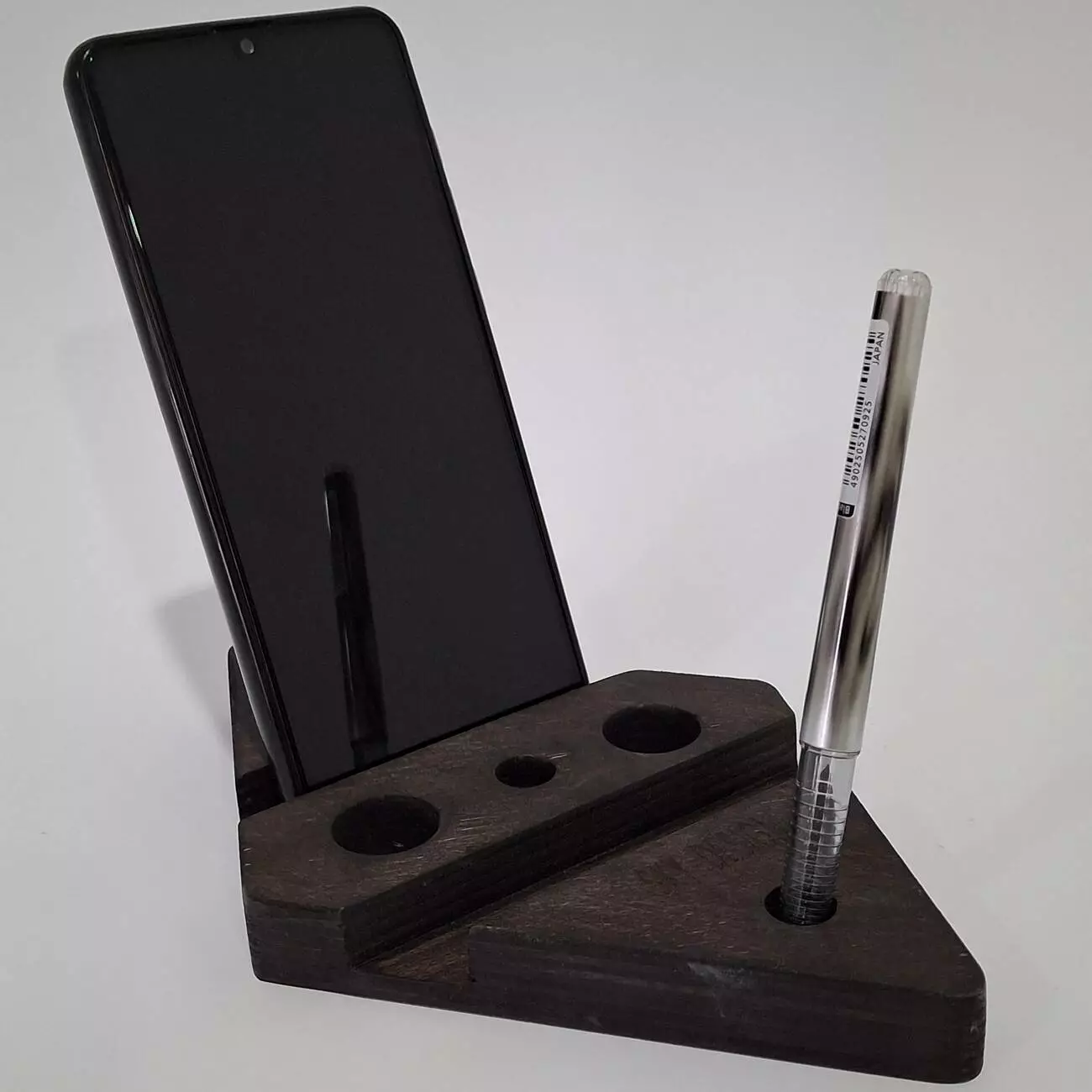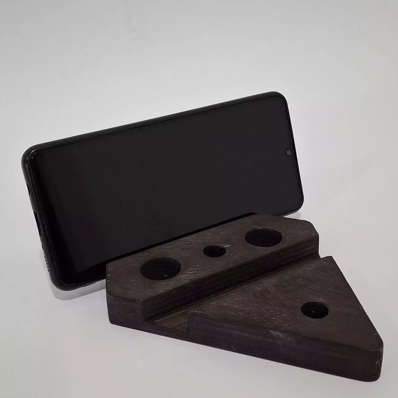 Тримач виконаний з натуральної вологостійкої фанери, товщиною 18мм. Має ергономічну форму, яка дозволить розташувати Ваш гаджет в будь-якому зручному положенні. Має декілька фіксуючих положень, дозволяє розміщувати телефон як горизонтально так і вертикально.