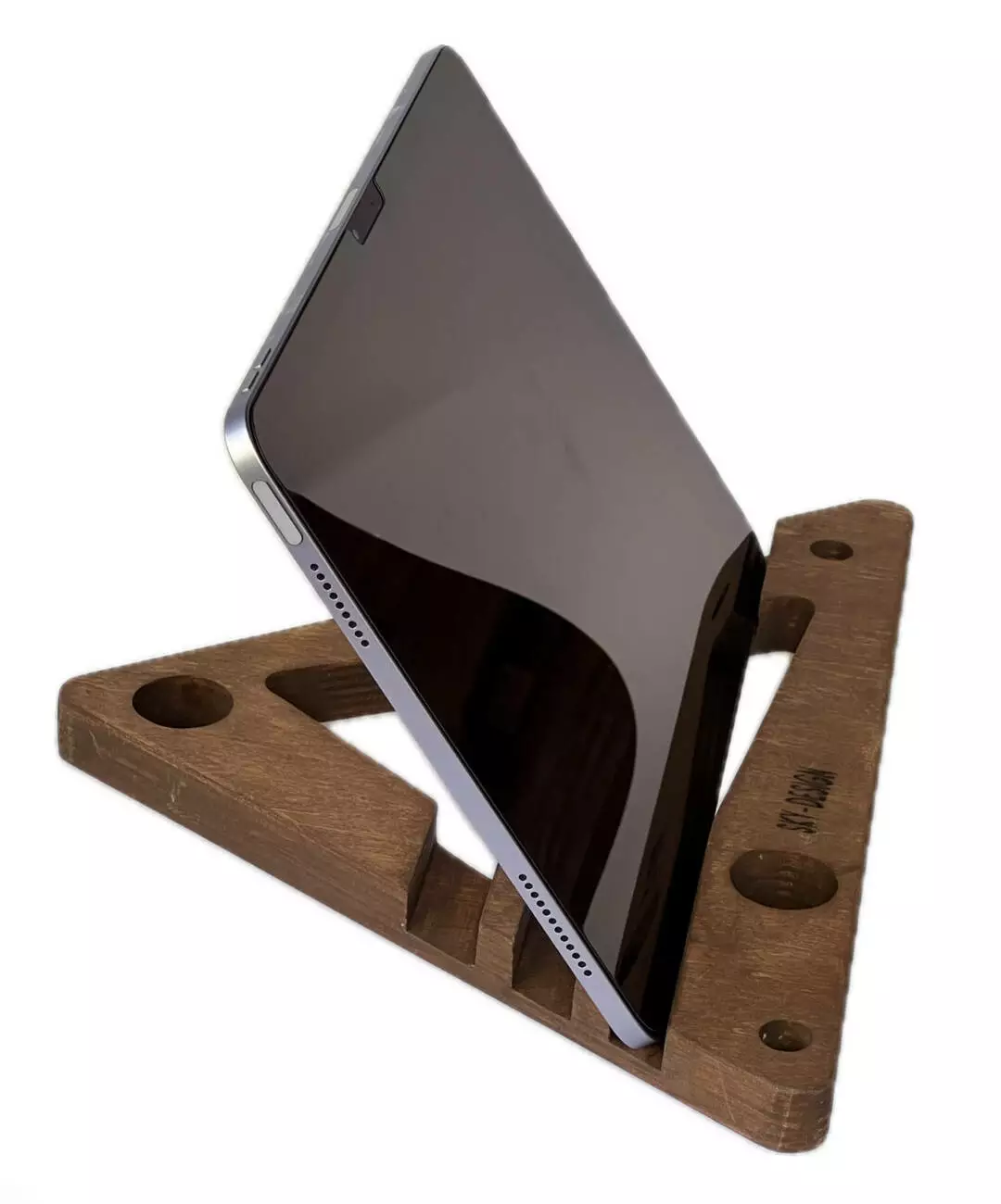 Тримач виконаний з натуральної вологостійкої фанери, товщиною 18мм. Має ергономічну форму, яка дозволить розташувати Ваш гаджет в будь-якому зручному положенні. Має декілька фіксуючих положень, дозволяє розміщувати планшет чи телефон під різним нахилом.